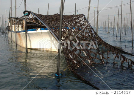 夕暮れ時の海苔養殖場での海苔の摘採の光景