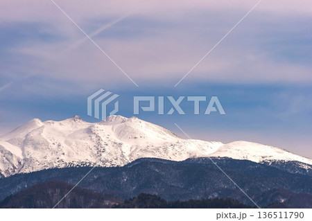 冬の南アルプス 農村と南アルプス鳳凰三山の風景 北杜市から 山梨県
