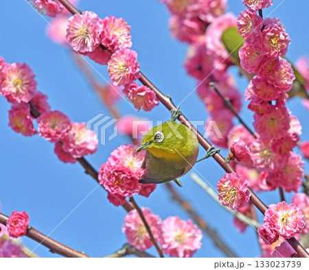 満開の紅梅にメジロさん ( 春イメージ )( 春うららかイメージ )