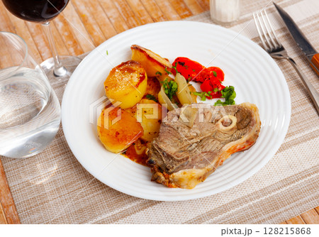 Side dish of baked lamb leg with potatoes and pepper