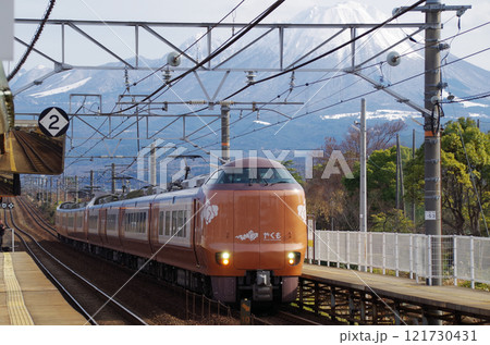 正月連休の旅行客を乗せて冠雪の大山をバックに山陰本線を走る出雲行きの在来線特急電車273系やくも7号
