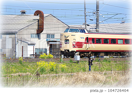 山陰本線を快走する国鉄色の特急やくも号(イラスト風)