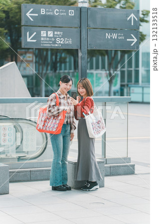 友達と秋の旅行に出かけてスマホで写真を撮る女性