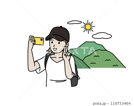 ハイキングや登山、スマホで自撮りする若い女性のイラスト