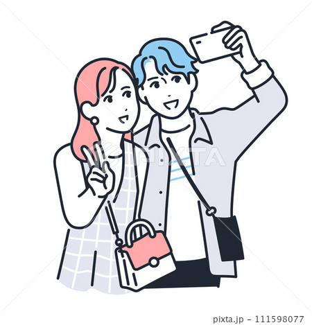 スマートフォンで写真を撮るカップルのシンプルなベクターイラスト素材