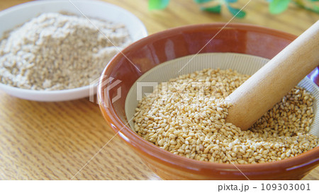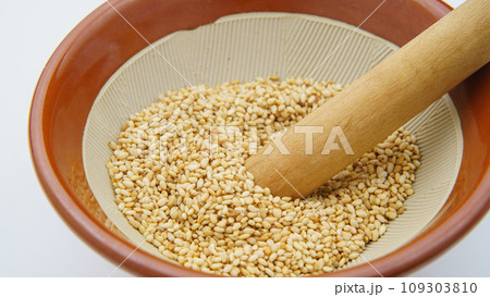 すり鉢と白ごま、すり胡麻。小さいサイズのすり鉢と擂粉木、白ごま(炒りごま)です。ゴマは擦っています。