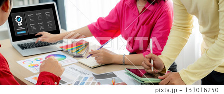 Holding and choosing different colored materials. Industry workers are in the building at daytime. Construction location