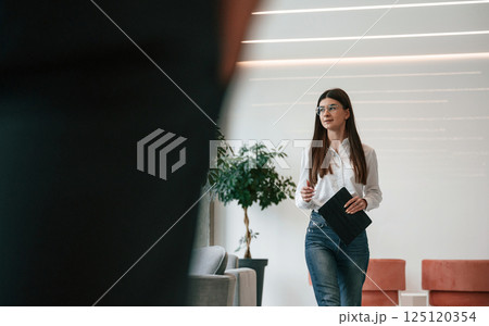 With digital tablet in hands. Young woman in glasses and in formal wear is indoors