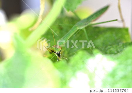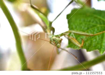 キュウリ棚に住みついた緑色のカマキリ