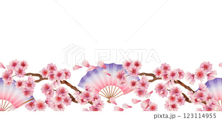 Horizontal frame of folding fan, branches with sakura flowers isolated on white background. Seamless border. Spring blooming cherry blossom flowers for Hanami. Watercolor template for textile, banner.