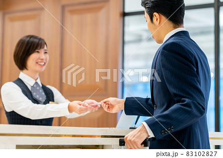 ホテルのフロントでチェックインするビジネスマン 撮影協力:WEEK芝大門(サンフロンティア不動産)