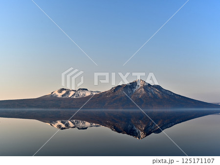 夜明けの湖面に映る春の逆さ樽前山と風不死岳