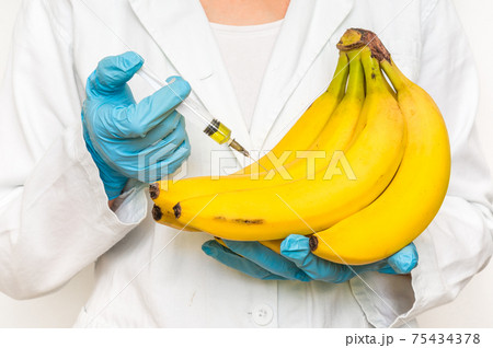Fruits on a white background bananas, orange, melon, lemon and nectarine, next is a syringe with gmo and nitrates, genetically modified organism, fruit