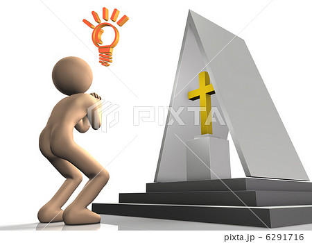 大きな十字架の記念碑。祈りを捧げる人物。平和への希望と弔いを表す抽象的なコンセプト。