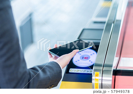 タッチレス技術で改札を通行するビジネスマン(手元・アップ・ボディパーツ)