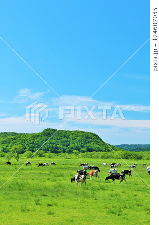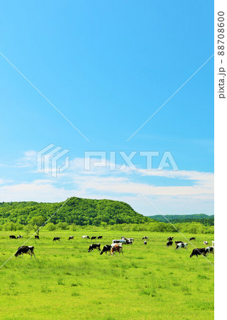 北海道 夏の青空と牧場の牛たち