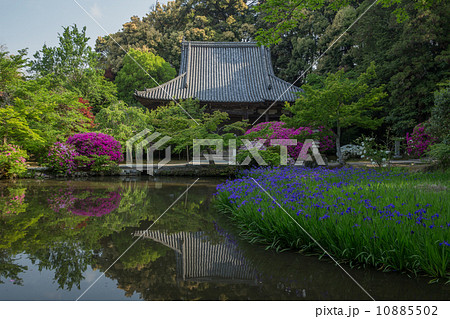 奈良 長岳寺 放生池の杜若と境内のツツジ(正面横位置)
