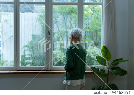 災害時にスマホで連絡をするシニア女性(避難警報・台風)