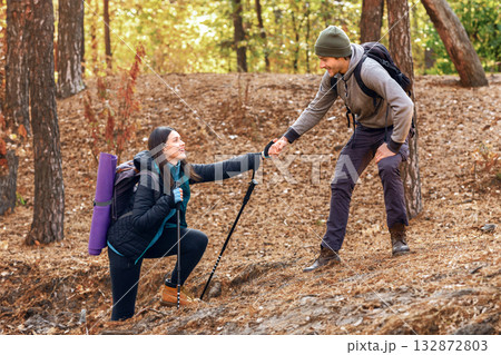 Handsome man hiker helping his girlfriend uphill in forest, couple hiking together