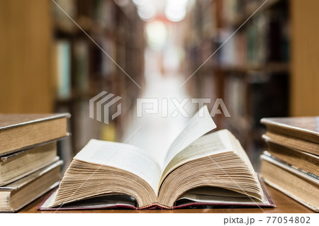 Old book in library with open textbook, stack piles of literature text archive on reading desk, and blur aisle of bookshelves in school study class room background for education learning concept