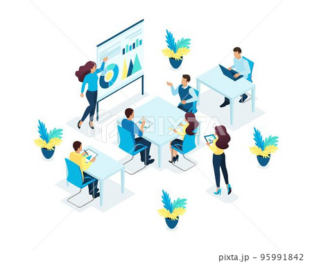 Isometric concept of office staff training, coaching, professional development. Concept for web design