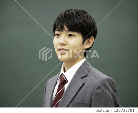 「ブレザー制服の男子高校生がホワイトボードを指さしながら笑顔を見せている」画像