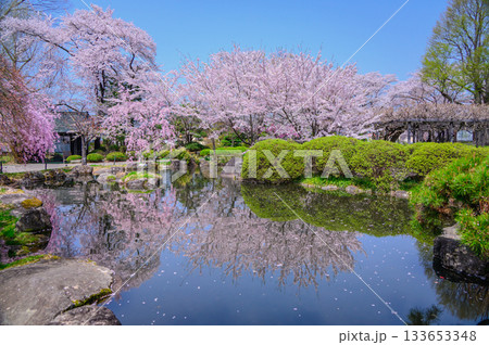 【心字池】池に舞い散った花びらと満開のサクラ【諏訪高島城】
