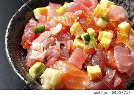 鮪やサーモン、きゅうりやとびこなどが入った海鮮丼(黒背景)