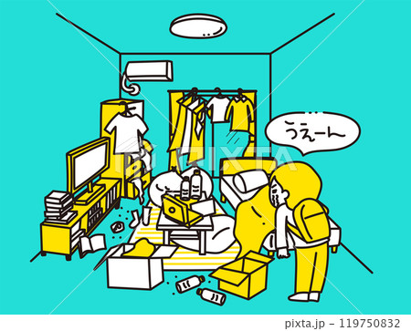 散らかった部屋と、それを見て嘆いている人(パステル)