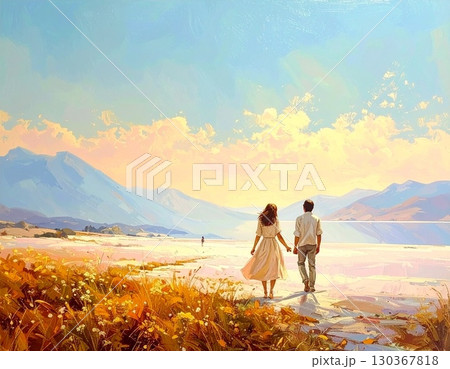 秋の草原と湖を散策する男女