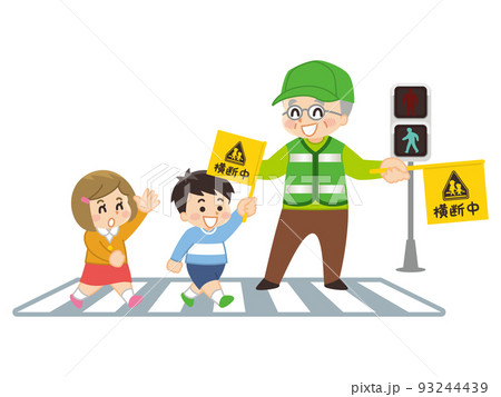 横断歩道を渡る子供たち 見守る緑のおじさん 交通安全