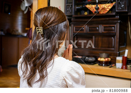仏間の仏壇に手を合わせる若い女性の後ろ姿