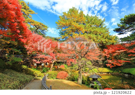 【東京都】シンメトリーな東京都庭園美術館の日本庭園の茶屋と紅葉