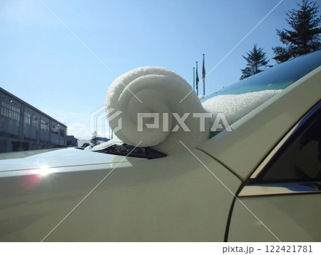 乗用車の窓に積もった雪が晴天の気温上昇で徐々に滑り落ちながら渦巻き状に丸まった珍しい自然現象