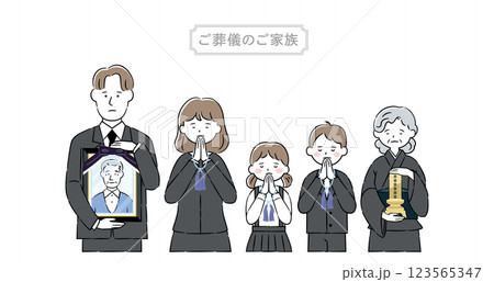 ベクターイラスト素材:喪服を着た家族、手を合わせて拝む