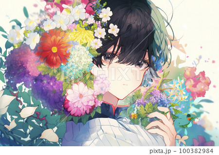 鮮やかでカラフルな花に包まれた男性の優しい微笑み「AI生成画像」