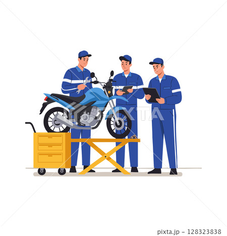 Motorcycle repair team working on blue motorbike in workshop with tools and checklist vector illustration