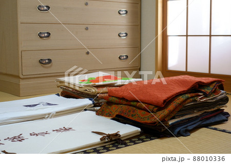 不要な着物を整理しようと和ダンスを開けて、中から出して積み上げてある和室