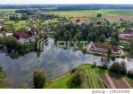 Jaunpils castle was built in 1301. as Livonia Order fortress. Latvia, aerial drone view