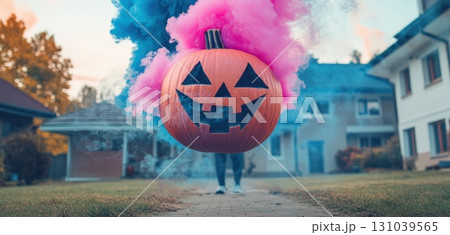 Pumpkin with vibrant smoke in a cozy neighborhood setting