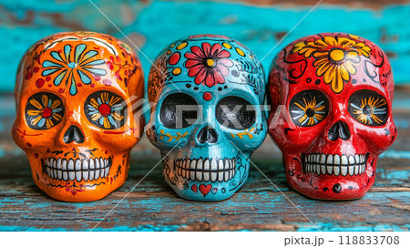 Colorful sugar skull with flowers on blue background. Concept of Dia de los Muertos, celebration, art and culture.