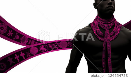 Abstract silhouette of a man with tribal patterns and purple lines on a white background