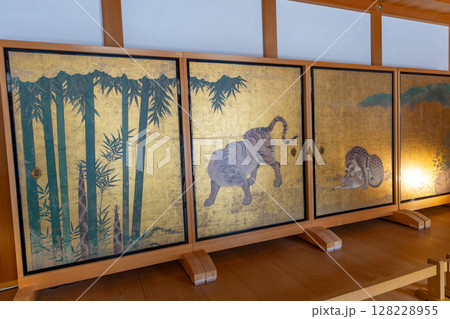 名古屋城本丸御殿の内部にある襖絵。金箔仕上げに虎や豹などの動物が描かれた日本の伝統美。