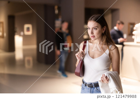 Portrait of a confident woman with an information booklet, standing in the hall of the historical museum next to the exhibit, located in glass cabinet