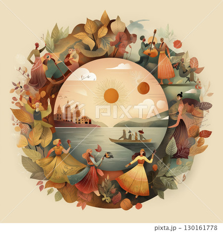 Celebration of cultural dance, music, and traditional attire around scenic river with temples and boats, surrounded by colorful leaves and nature