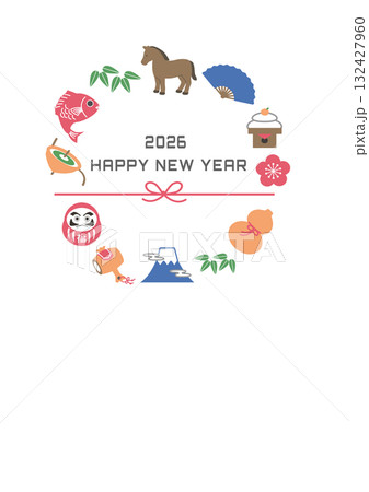 年賀状2026 ウマと縁起物のイラスト テンプレート