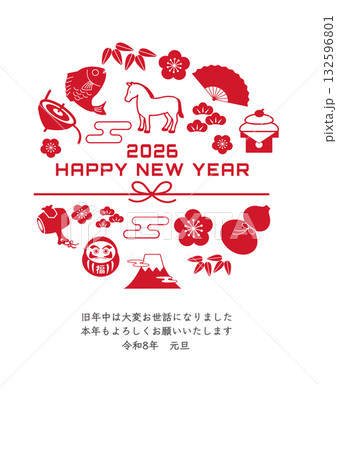 2026年の年賀状イラスト(馬と日本のお正月アイコン)