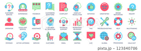Customer service icon set in flat duotone solid icons web design. Pack pictograms with experience, feedback, question, conflict resolution, satisfied, brand reputation, other. Illustration.