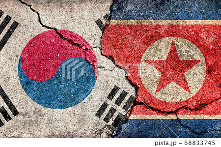 国際紛争・政治対立 / 汚れた国旗イラスト (韓国 vs 北朝鮮 )/ひび割れたコンクリートの壁
