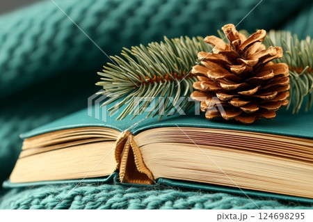 Open book on cozy knit blanket with pine cone and evergreen branch during winter season